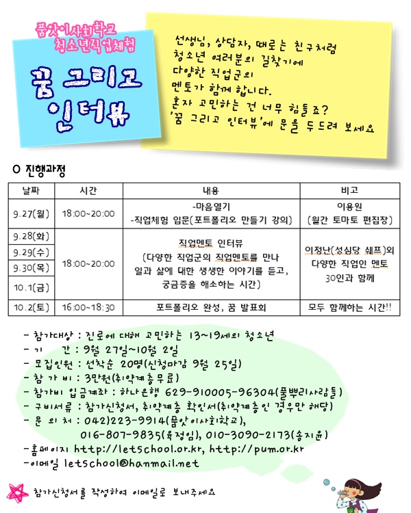 제목 [품앗이사회학교] 청소년 직업체험 '꿈 그리고 인터뷰(9월)' 모집!!