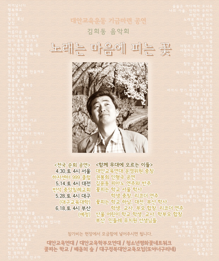 | 제목 | <공연> 대안교육운동 기금마련 김희동 음악회 '노래는 마음에 피는 꽃' |