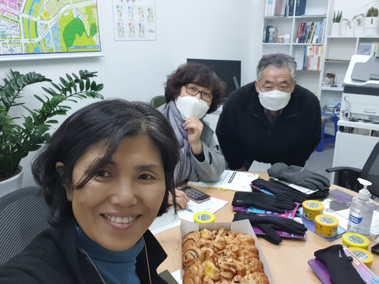 한빛 무지개 부동산에서 내년도 건강반을 어떻게 꾸릴지 논의하고 남은 잔액은 겨울 등산장갑을 구입하여 나누었다.(장갑5개)