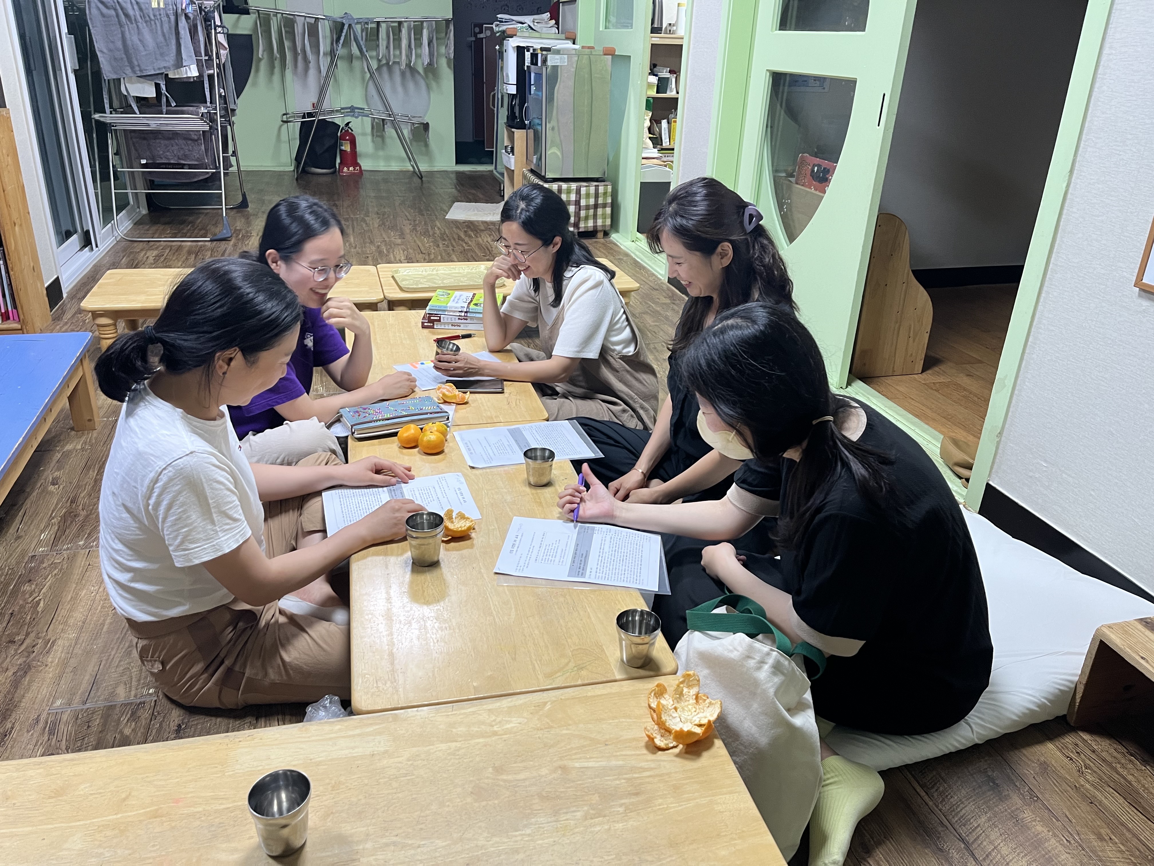 <놀면서 자라고, 살면서 배우는 아이들> 책을 함께 읽고 나누는 시간을 가졌습니다 친구랑 어린이집의 별명부르기, 마실, 날적이쓰기, 공동체 문화에 대한 발제와 생각을 이야기했습니다